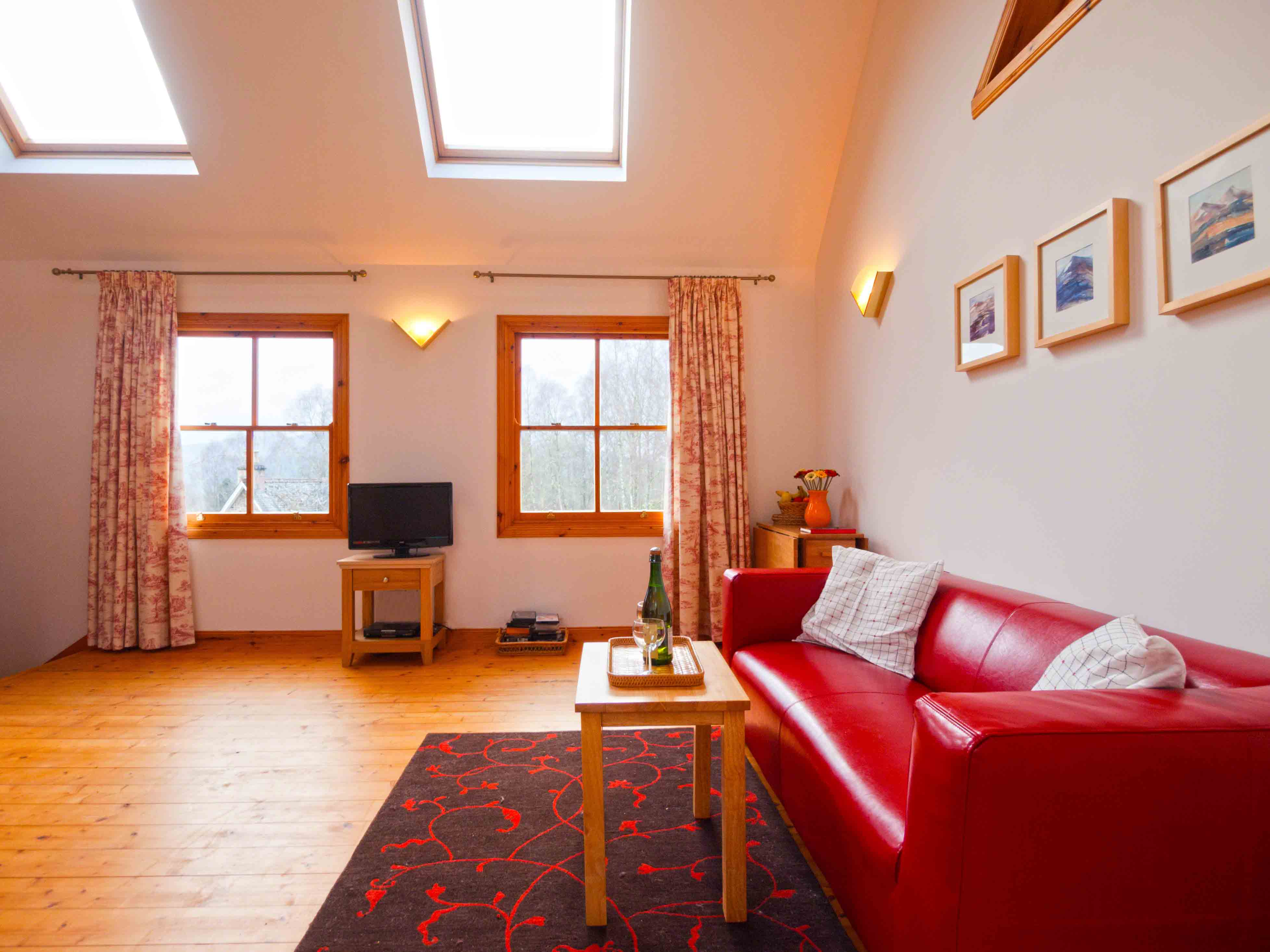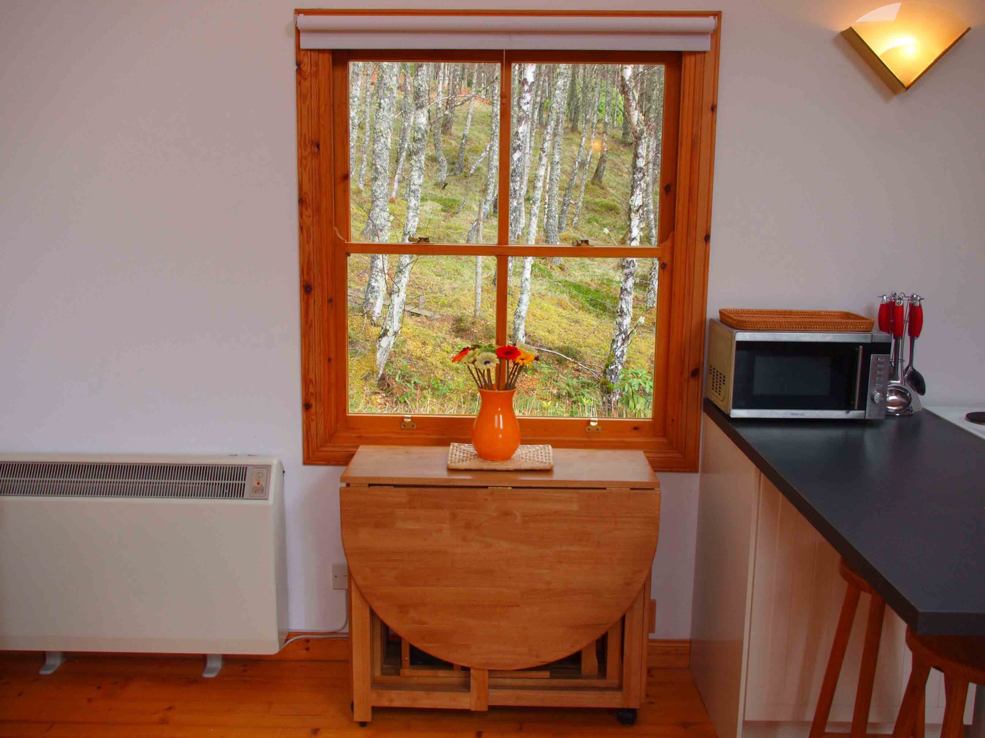 Fern Cottage - Kitchen / Lounge AreaThe kitchen/lounge area has a spacious open plan layout and double height ceilings with skylights making it a bright and warm space. There are lovely views to the west over the gardens and across to Beinn a’ Bhathaich Ard and also over the burn that runs to the east behind the cottage.