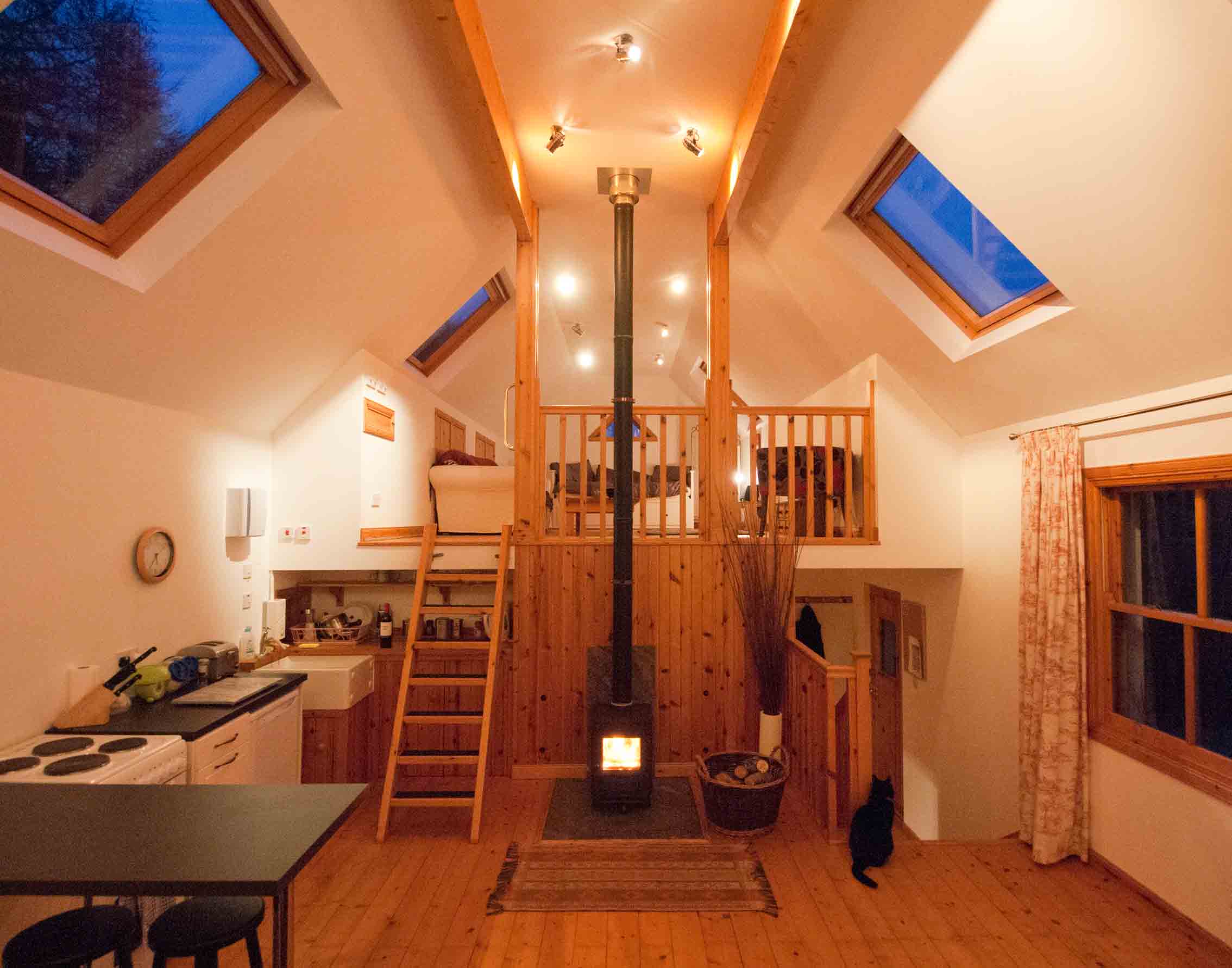 Fern Cottage - Kitchen / Lounge AreaThe kitchen/lounge area has a spacious open plan layout and double height ceilings with skylights making it a bright and warm space. There are lovely views to the west over the gardens and across to Beinn a’ Bhathaich Ard and also over the burn that runs to the east behind the cottage.